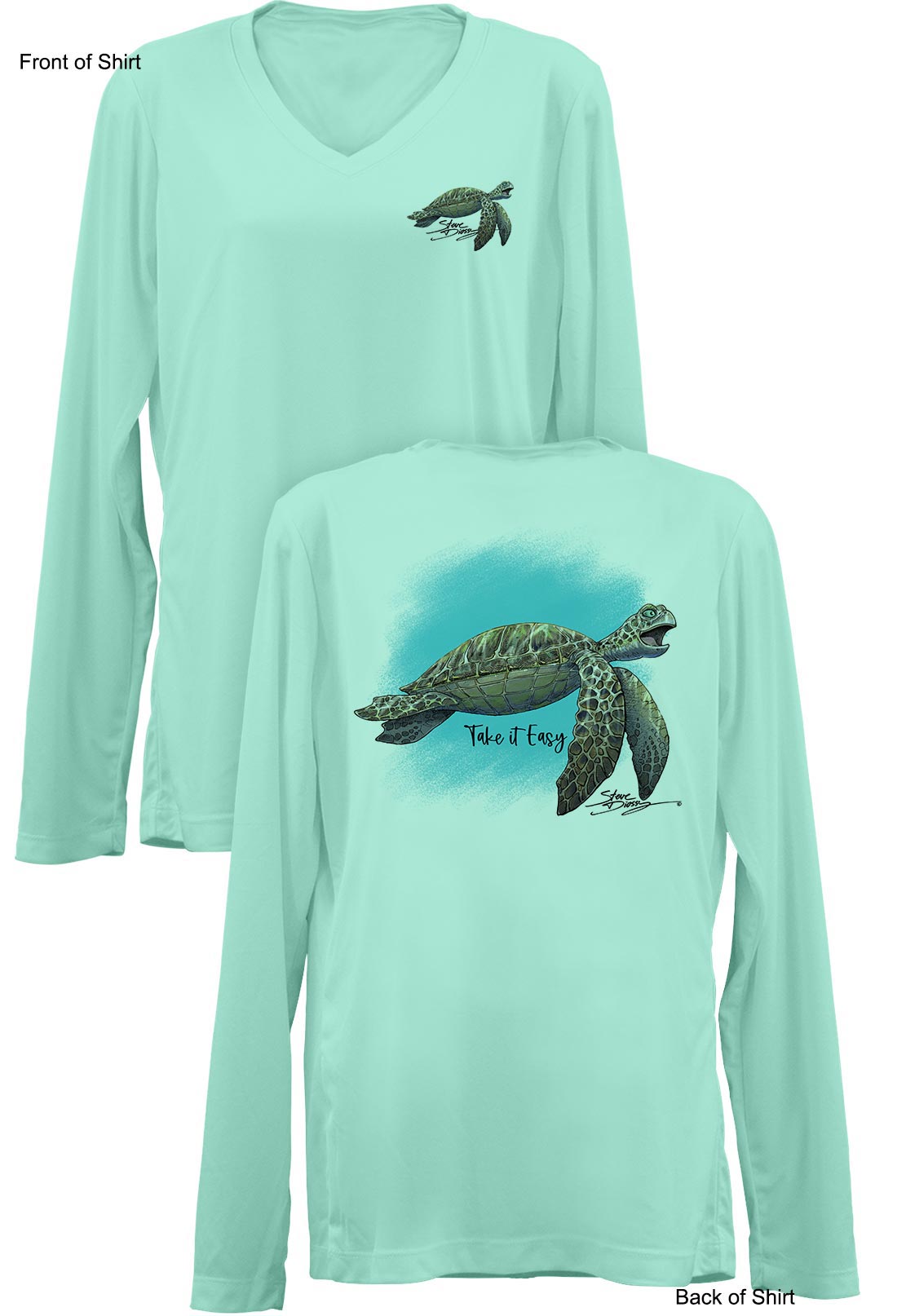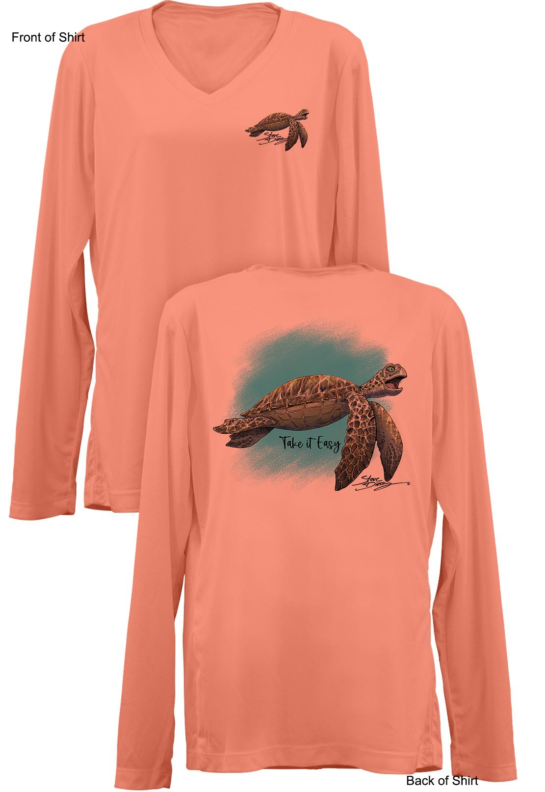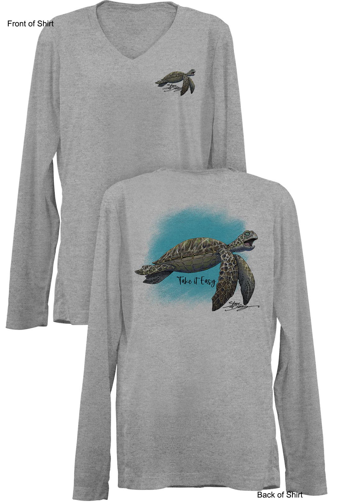 Take It Easy Turtle- Ladies Long Sleeve V-Neck-100% Polyester