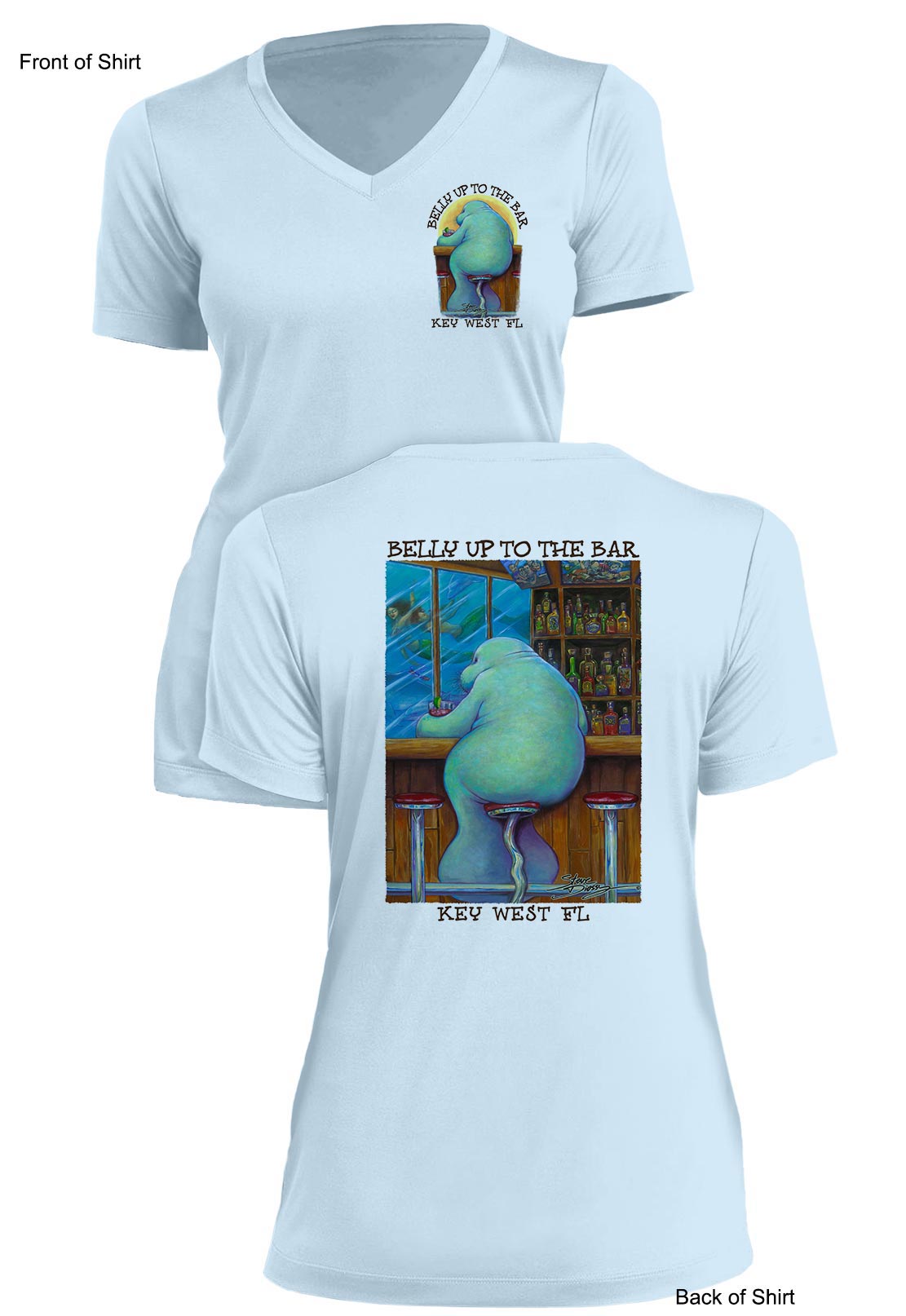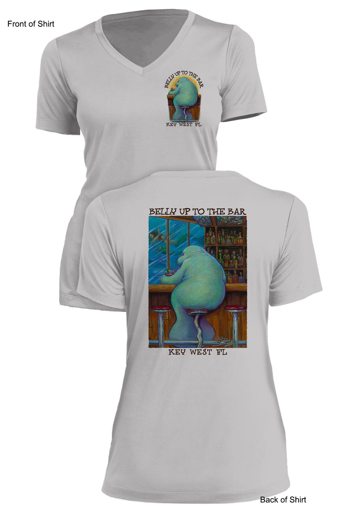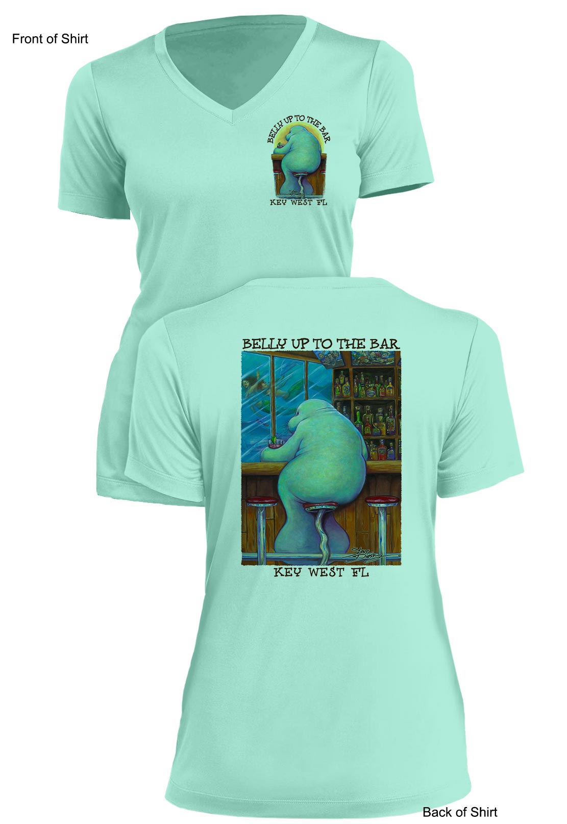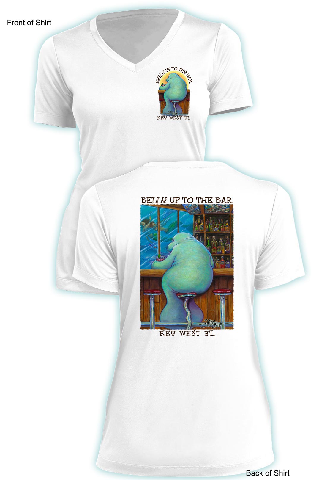 Shirt Reads: Belly up to the bar, Key West, FL Superwick- Wicks 3 times fasterSun Protection UPF 50+Recycled microfiber polyester/spandexEco-Friendly yarn made from recycled bottlesAnti-microbial finishWrinkle...