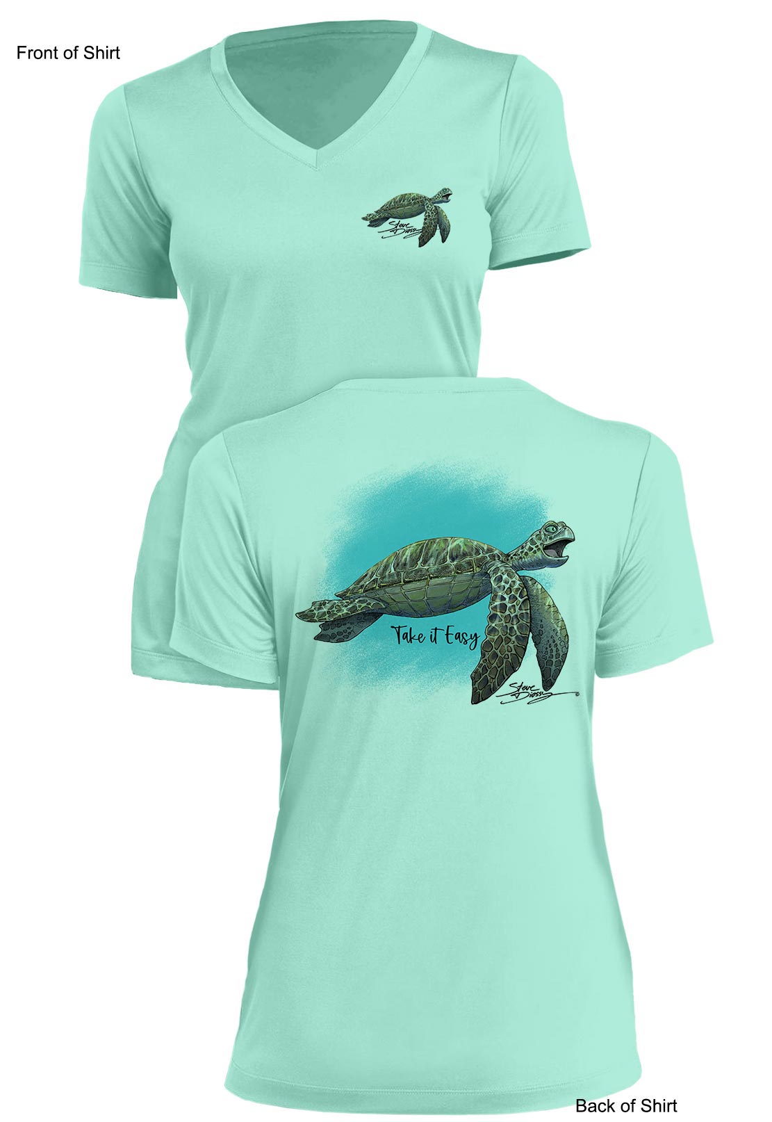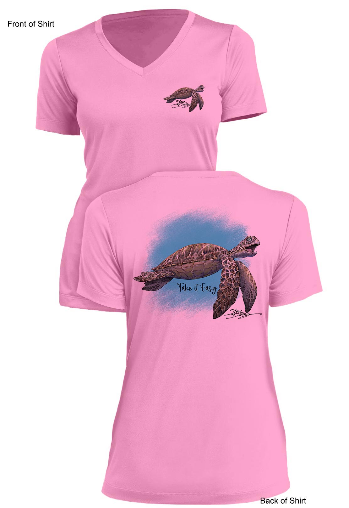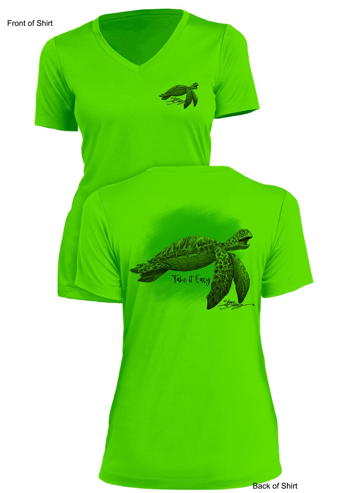 Take It Easy Turtle- Ladies Short Sleeve V-Neck-100% Polyester