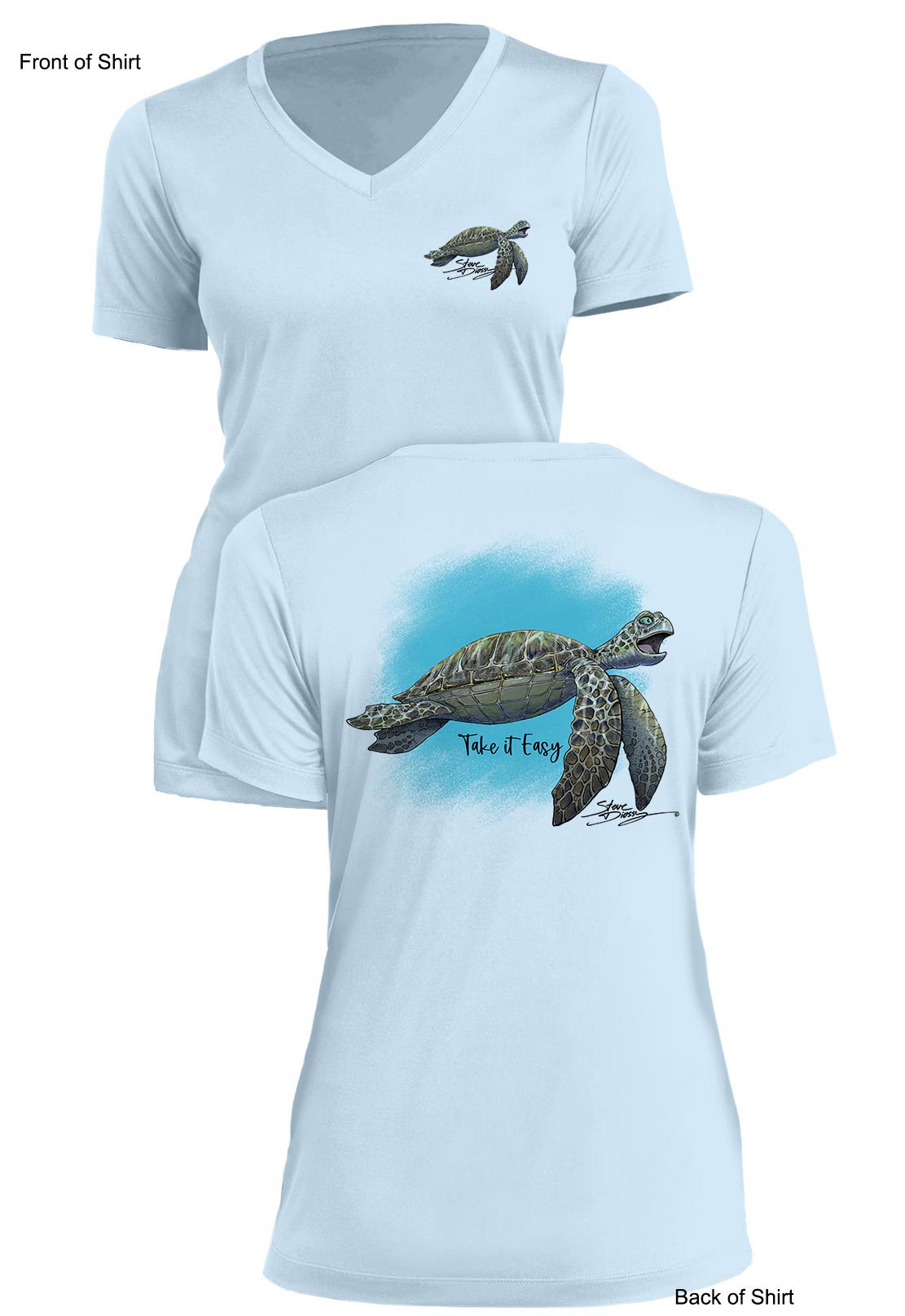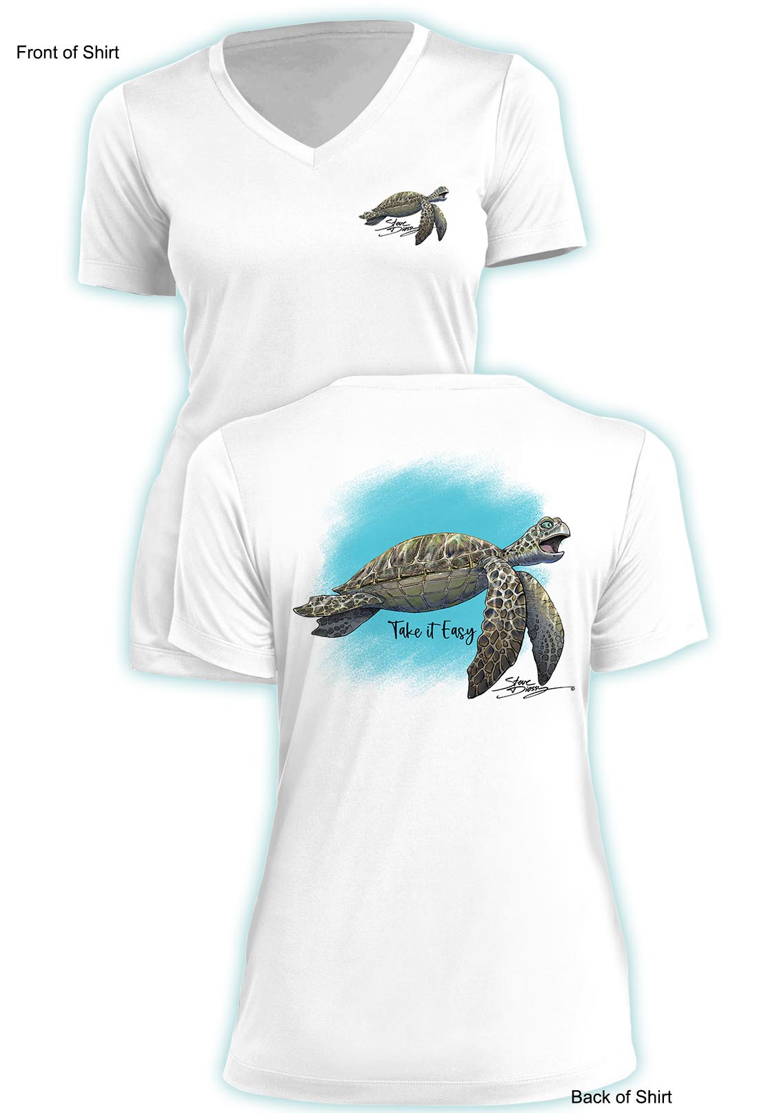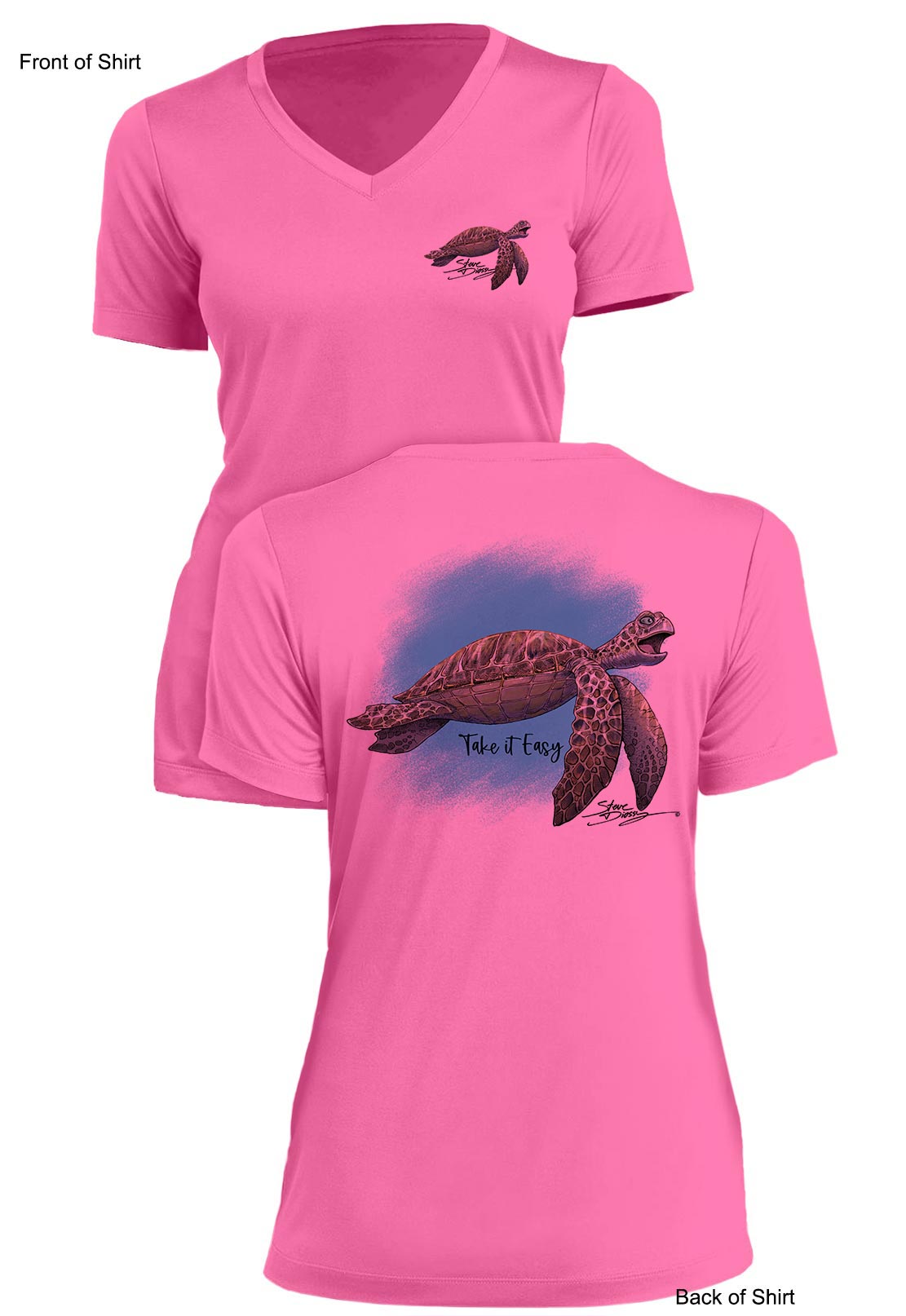 Take It Easy Turtle- Ladies Short Sleeve V-Neck-100% Polyester
